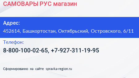 САМОВАРЫ.РУС, магазин по адресу 452614, Башкортостан, Октябрьский, Островского, 6/11 в дальнейшем Организация, размещена в следующих категориях: