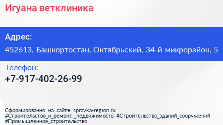 Игуана, ветклиника по адресу 452613, Башкортостан, Октябрьский, 34-й микрорайон, 5 в дальнейшем Организация, размещена в следующих категориях: