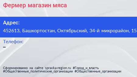 Фермер, магазин мяса по адресу 452613, Башкортостан, Октябрьский, 34-й микрорайон, 15 в дальнейшем Организация, размещена в следующих категориях: