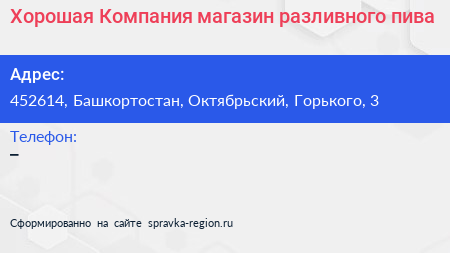 Хорошая Компания, магазин разливного пива по адресу 452614, Башкортостан, Октябрьский, Горького, 3 в дальнейшем Организация, размещена в следующих категориях: