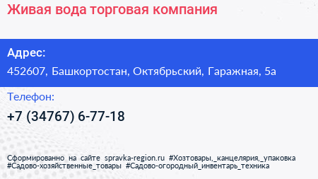 Живая вода, торговая компания по адресу 452607, Башкортостан, Октябрьский, Гаражная, 5а в дальнейшем Организация, размещена в следующих категориях:
