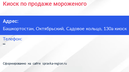 Киоск по продаже мороженого по адресу Башкортостан, Октябрьский, Садовое кольцо, 130а киоск в дальнейшем Организация, размещена в следующих категориях: