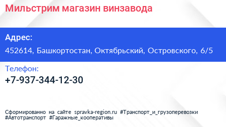 Мильстрим, магазин винзавода по адресу 452614, Башкортостан, Октябрьский, Островского, 6/5 в дальнейшем Организация, размещена в следующих категориях: