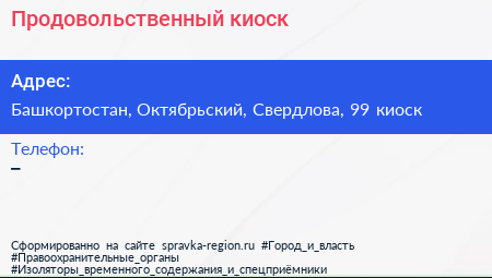 Продовольственный киоск по адресу Башкортостан, Октябрьский, Свердлова, 99 киоск в дальнейшем Организация, размещена в следующих категориях: