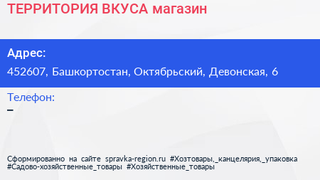ТЕРРИТОРИЯ ВКУСА, магазин по адресу 452607, Башкортостан, Октябрьский, Девонская, 6 в дальнейшем Организация, размещена в следующих категориях:
