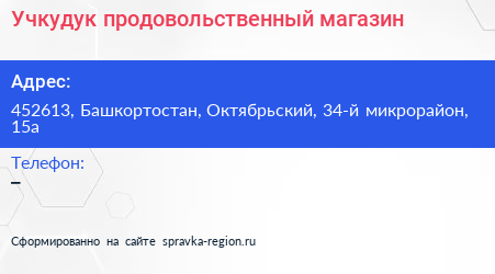 Учкудук, продовольственный магазин по адресу 452613, Башкортостан, Октябрьский, 34-й микрорайон, 15а в дальнейшем Организация, размещена в следующих категориях: