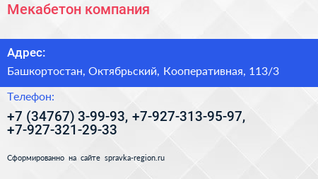 Мекабетон, компания по адресу Башкортостан, Октябрьский, Кооперативная, 113/3 в дальнейшем Организация, размещена в следующих категориях: