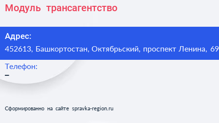 Модуль+, трансагентство по адресу 452613, Башкортостан, Октябрьский, проспект Ленина, 69 в дальнейшем Организация, размещена в следующих категориях: