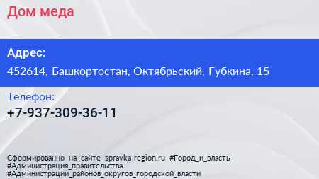 Дом меда по адресу 452614, Башкортостан, Октябрьский, Губкина, 15 в дальнейшем Организация, размещена в следующих категориях: