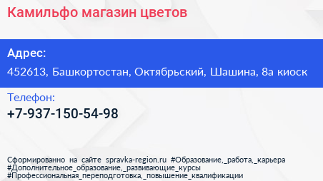 Камильфо, магазин цветов по адресу 452613, Башкортостан, Октябрьский, Шашина, 8а киоск в дальнейшем Организация, размещена в следующих категориях: