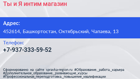 Ты и Я, интим-магазин по адресу 452614, Башкортостан, Октябрьский, Чапаева, 13 в дальнейшем Организация, размещена в следующих категориях: