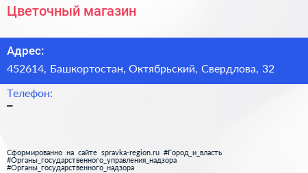 Цветочный магазин по адресу 452614, Башкортостан, Октябрьский, Свердлова, 32 в дальнейшем Организация, размещена в следующих категориях: