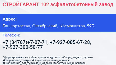 СТРОЙГАРАНТ 102, асфальтобетонный завод по адресу Башкортостан, Октябрьский, Космонавтов, 59Б в дальнейшем Организация, размещена в следующих категориях: