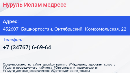 Нуруль Ислам, медресе по адресу 452607, Башкортостан, Октябрьский, Комсомольская, 22 в дальнейшем Организация, размещена в следующих категориях: