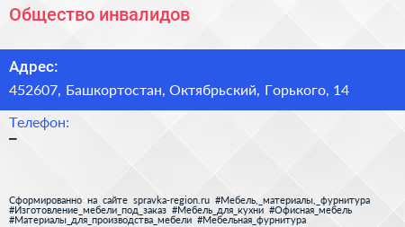Общество инвалидов по адресу 452607, Башкортостан, Октябрьский, Горького, 14 в дальнейшем Организация, размещена в следующих категориях: