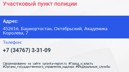 Участковый пункт полиции по адресу 452616, Башкортостан, Октябрьский, Академика Королева, 7 в дальнейшем Организация, размещена в следующих категориях: