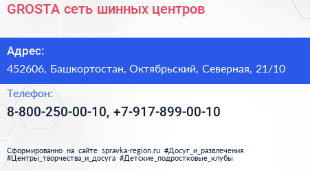 GROSTA, сеть шинных центров по адресу 452606, Башкортостан, Октябрьский, Северная, 21/10 в дальнейшем Организация, размещена в следующих категориях: