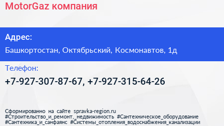 MotorGaz, компания по адресу Башкортостан, Октябрьский, Космонавтов, 1д в дальнейшем Организация, размещена в следующих категориях:
