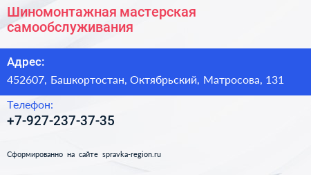 Шиномонтажная мастерская самообслуживания по адресу 452607, Башкортостан, Октябрьский, Матросова, 131 в дальнейшем Организация, размещена в следующих категориях: