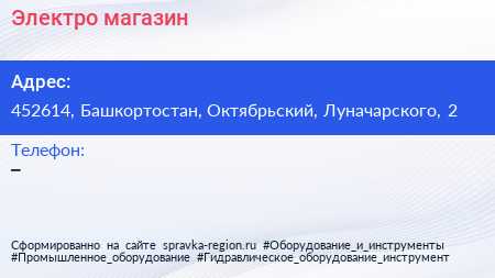Электро, магазин по адресу 452614, Башкортостан, Октябрьский, Луначарского, 2 в дальнейшем Организация, размещена в следующих категориях: