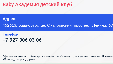 Baby-Академия, детский клуб по адресу 452613, Башкортостан, Октябрьский, проспект Ленина, 69 в дальнейшем Организация, размещена в следующих категориях: