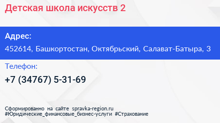 Детская школа искусств №2 по адресу 452614, Башкортостан, Октябрьский, Салават-Батыра, 3 в дальнейшем Организация, размещена в следующих категориях: