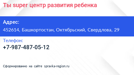 Tы super, центр развития ребенка по адресу 452614, Башкортостан, Октябрьский, Свердлова, 29 в дальнейшем Организация, размещена в следующих категориях: