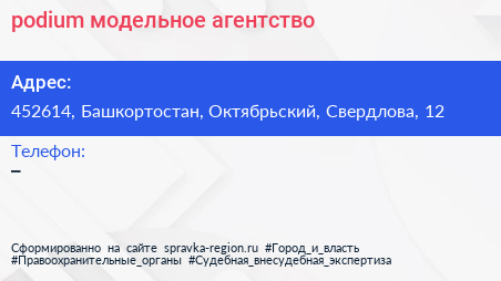 podium, модельное агентство по адресу 452614, Башкортостан, Октябрьский, Свердлова, 12 в дальнейшем Организация, размещена в следующих категориях: