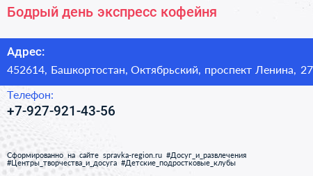 Бодрый день, экспресс-кофейня по адресу 452614, Башкортостан, Октябрьский, проспект Ленина, 27 в дальнейшем Организация, размещена в следующих категориях: