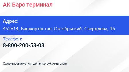 АК Барс, терминал по адресу 452614, Башкортостан, Октябрьский, Свердлова, 16 в дальнейшем Организация, размещена в следующих категориях: