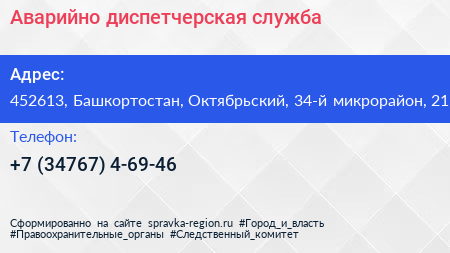 Аварийно-диспетчерская служба по адресу 452613, Башкортостан, Октябрьский, 34-й микрорайон, 21 в дальнейшем Организация, размещена в следующих категориях: