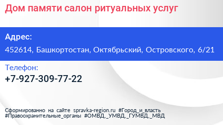 Дом памяти, салон ритуальных услуг по адресу 452614, Башкортостан, Октябрьский, Островского, 6/21 в дальнейшем Организация, размещена в следующих категориях: