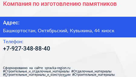 Компания по изготовлению памятников по адресу Башкортостан, Октябрьский, Кувыкина, 44 киоск в дальнейшем Организация, размещена в следующих категориях: