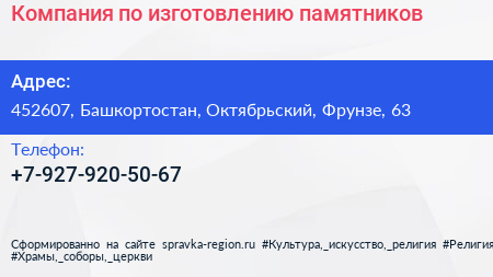Компания по изготовлению памятников по адресу 452607, Башкортостан, Октябрьский, Фрунзе, 63 в дальнейшем Организация, размещена в следующих категориях: