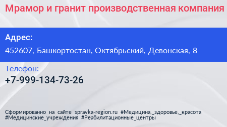 Мрамор и гранит, производственная компания по адресу 452607, Башкортостан, Октябрьский, Девонская, 8 в дальнейшем Организация, размещена в следующих категориях: