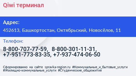 Qiwi, терминал по адресу 452613, Башкортостан, Октябрьский, Новосёлов, 11 в дальнейшем Организация, размещена в следующих категориях: