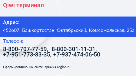 Qiwi, терминал по адресу 452607, Башкортостан, Октябрьский, Комсомольская, 25а в дальнейшем Организация, размещена в следующих категориях:
