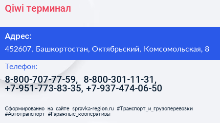 Qiwi, терминал по адресу 452607, Башкортостан, Октябрьский, Комсомольская, 8 в дальнейшем Организация, размещена в следующих категориях: