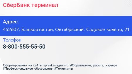 СберБанк, терминал по адресу 452607, Башкортостан, Октябрьский, Садовое кольцо, 21 в дальнейшем Организация, размещена в следующих категориях: