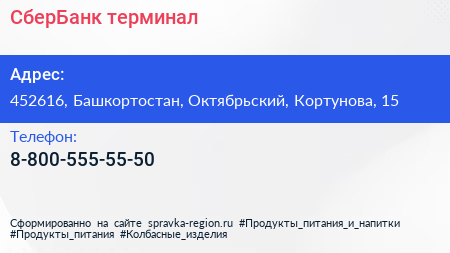 СберБанк, терминал по адресу 452616, Башкортостан, Октябрьский, Кортунова, 15 в дальнейшем Организация, размещена в следующих категориях: