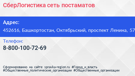 СберЛогистика, сеть постаматов по адресу 452616, Башкортостан, Октябрьский, проспект Ленина, 57 в дальнейшем Организация, размещена в следующих категориях: