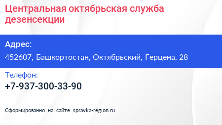 Центральная октябрьская служба дезенсекции по адресу 452607, Башкортостан, Октябрьский, Герцена, 28 в дальнейшем Организация, размещена в следующих категориях: