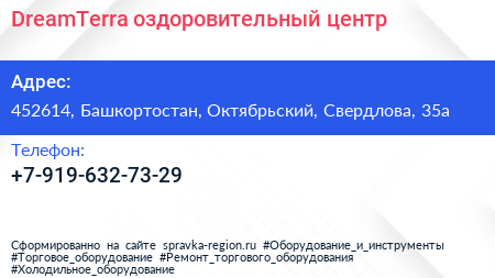 DreamTerra, оздоровительный центр по адресу 452614, Башкортостан, Октябрьский, Свердлова, 35а в дальнейшем Организация, размещена в следующих категориях: