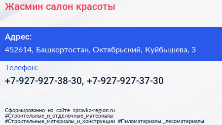 Жасмин, салон красоты по адресу 452614, Башкортостан, Октябрьский, Куйбышева, 3 в дальнейшем Организация, размещена в следующих категориях: