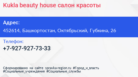 Kukla beauty house, салон красоты по адресу 452614, Башкортостан, Октябрьский, Губкина, 26 в дальнейшем Организация, размещена в следующих категориях: