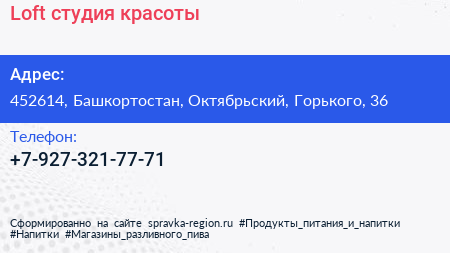 Loft, студия красоты по адресу 452614, Башкортостан, Октябрьский, Горького, 36 в дальнейшем Организация, размещена в следующих категориях: