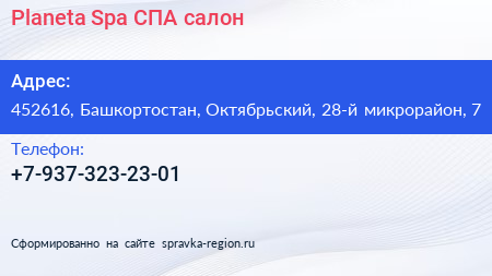 Planeta Spa, СПА-салон по адресу 452616, Башкортостан, Октябрьский, 28-й микрорайон, 7 в дальнейшем Организация, размещена в следующих категориях: