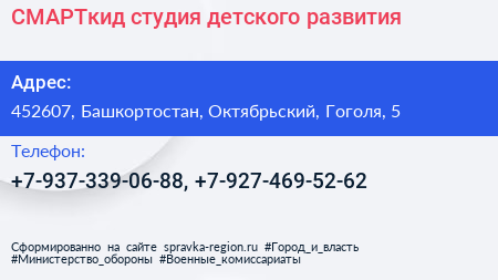 СМАРТкид, студия детского развития по адресу 452607, Башкортостан, Октябрьский, Гоголя, 5 в дальнейшем Организация, размещена в следующих категориях: