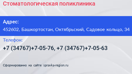 Стоматологическая поликлиника по адресу 452602, Башкортостан, Октябрьский, Садовое кольцо, 34 в дальнейшем Организация, размещена в следующих категориях: