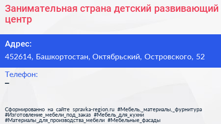 Занимательная страна, детский развивающий центр по адресу 452614, Башкортостан, Октябрьский, Островского, 52 в дальнейшем Организация, размещена в следующих категориях: